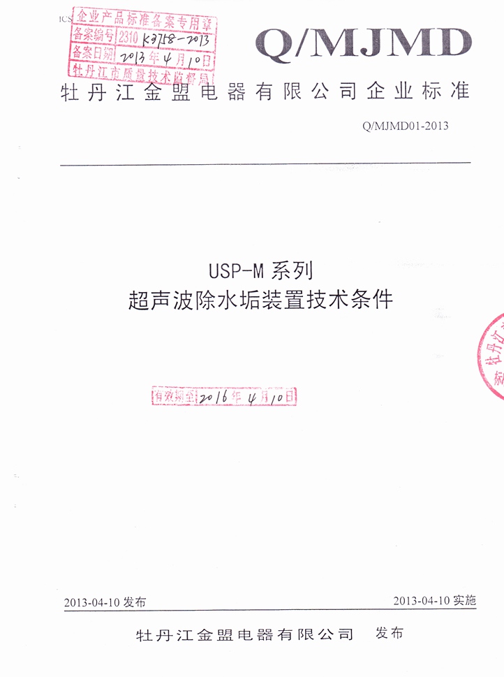 2013年4月10日,牡丹江金盟电器有限公司《USP-M系列超声波除水垢装置技术条件》正式通过技术监督局审核通过,同时发布并实施。
